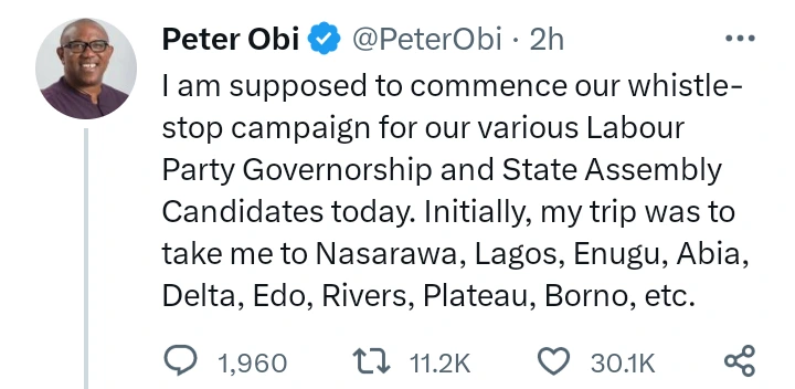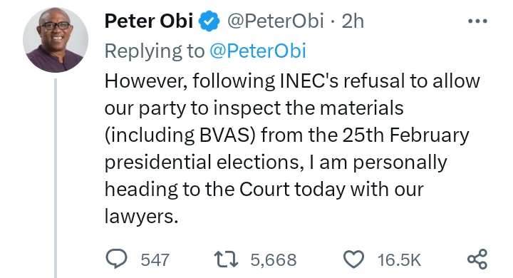 In a statement that was released on Twitter, Peter Obi said that he wanted to embark on a campaign trip to some states but following INEC's refusal to allow his party to inspect materials, he will be heading to court personally. Check out his post below